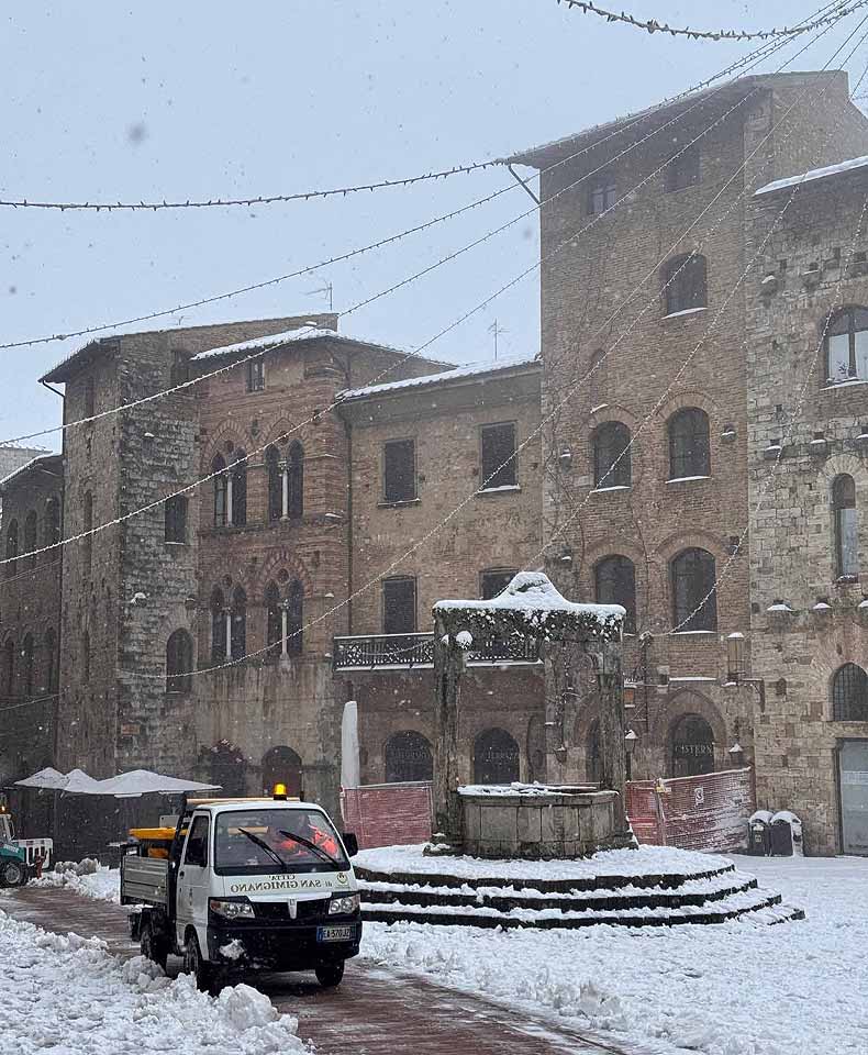 V Toskánsku sněží, budou se nosit kožichy :-) Připomínám Stefana Grandiho, vinaře ze San Gimignana, který mi v prosinci 2017 řekl: „Víš, Vladimíre, my víme, co je sníh… ale nesněží každý rok!“ Od rána se v lokálních facebookových skupinách objevují katastrofické fotky s centimetrovým popraškem. Chtěl jsem zajet fotit do Volterry a San Gimignama, ale nakonec jsem se rozhodl vyhnout se setkání s řidiči nepřipravenými na zimu. Bydlím 300 metrů od moře, je tady 5 stupňů nad nulou a žádný sníh. Moře stabilizuje teploty a ušetří mi spoustu peněz za vytápění. Nejenže jsou zdejší teploty o 10 až 15° vyšší než ve středních Čechách, ale jsou i o pět stupňů vyšší než padesát kilometrů na východ v italském vnitrozemí. I zde platí, že mráz přichází z Východu. (Na úvodní fotce je San Gimignano, Piazza della Cisterna. Na druhé Volterra, obě fotky ukradené na FB.)