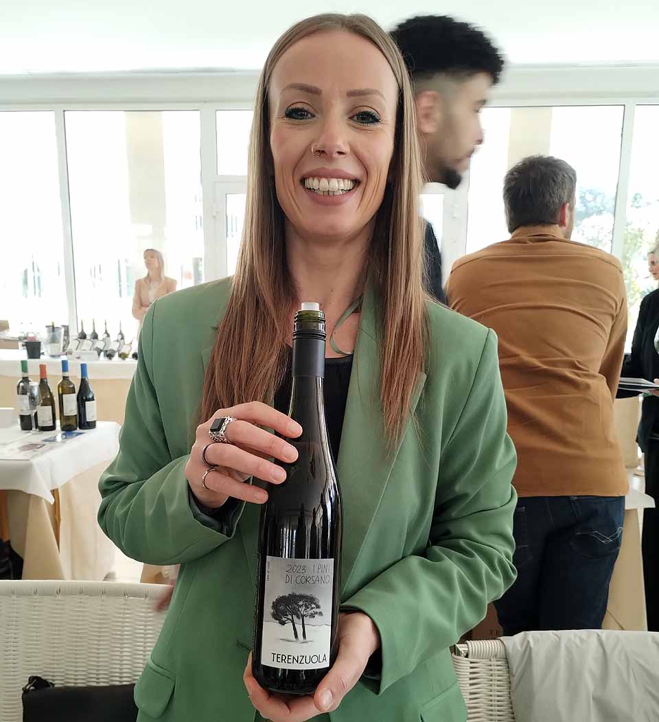 Camelia Lazar, Panizzi. Ve zbytku dne jsem oběhl tři sály a ochutnal pět dalších nových konkurenčních Vernaccií :-) Nebudu nikoho jmenovat, ale jeden z vinařů mě zná a lišácky se zeptal, kdo má Vernaccii nejlepší. Tak jsem podobně lišácky odvětil, že podle mě do špičky patří pět šest jmen a vyjmenoval je, ale hodinu poté jsem Camelii hlásil, že letos má nejlepší Vernaccii Panizzi. Každý to může posuzovat jinak a někdo bude hodnotit výš křupavé, koncentrované a téměř perlivé Vernaccie (nejmenuju). Já už několik let ujíždím na silné kyselině a ovocném projevu základní Vernaccie Panizzi, má skoro klasickou burgundskou stylistiku a čistotu, na mě to působí skoro konzervativně (navzdory technologické čistotě), prostě rovnováha mezi tradicí a modernou.
