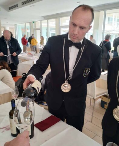 Když už jsem zmínil sklenku Sassicaii po snídani, tady je fotka. Sassicaiu nalévají someliéři FISAR v plné výstroji, ta snídaně je tam jen jako vtip. Hotelová snídaně končí v deset, degustace otvírá v jedenáct. Zkušení návštěvníci vědí, že u stolku Tenuty San Guido bude nával a dají si tam první zastávku minutu před jedenáctou.