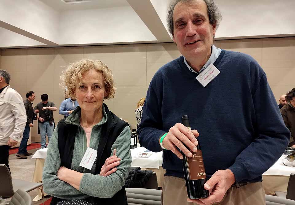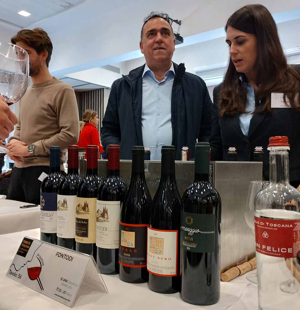 Měl jsem dvě velké priority, první byly návštěvy vinařství, která dovážím. To bylo snadné, byly tam dvě. Panizzi a Fattoria Ambra. Na fotce Giuseppe Rigoli s manželkou, Fattoria Ambra. Ochutnal jsem nové Vermentino 2025 a hlásím, že už řádně zakořenilo a má silnou kyselinu a dost ovoce. Barco Reale 2025 je plnější a v ovoci jde až do zralých švestek, zábavné je nové Carmignano Santa Cristina 2023. Středně plné, složením typické ale pozor, s anýzovým tónem v chuti navíc. Nebyl jsem si jistý, jestli to hodnotím správně (=jestli neblbnu), tak jsem se po dvou hodinách vrátil a přechutnal znova, je to tam! Nevím, jak se to bude vyvíjet, ale je zábavné. 13,5% alkoholu, takže dost pro strukturu, ale příjemně (málo) na pití. Podobně obě Riservy, Elzana 2022 a Montalbiolo 2022 jsou o trošku tenčí a lehčí než v minulém roce, ale krásně pitelné.